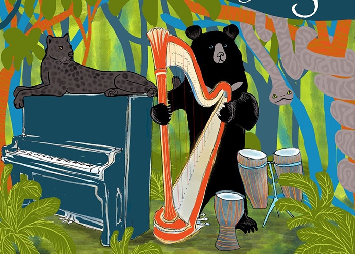 Dans cette adaptation libre du Livre de la Jungle de R. Kipling et de W. Disney, Vincent Bernard, comédien déjanté, incarne tous les personnages avec un brio inégalé, accompagné par Isabelle Olivier, harpiste et compositrice féérique pour un voyage inoubliable. La partition musicale est composée en un duo original harpe-batterie avec de nouveaux morceaux originaux et la reprise du formidable « Il en faut peu » de Baloo.