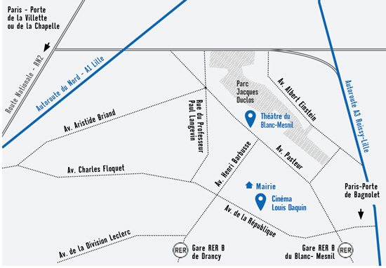 Prendre l’autoroute A1 direction Aéroport Charles De Gaulle, puis prendre la sortie Le Blanc-Mesnil. Après la sortie, prendre la RN2 vers Paris puis Blanc-Mesnil centre.